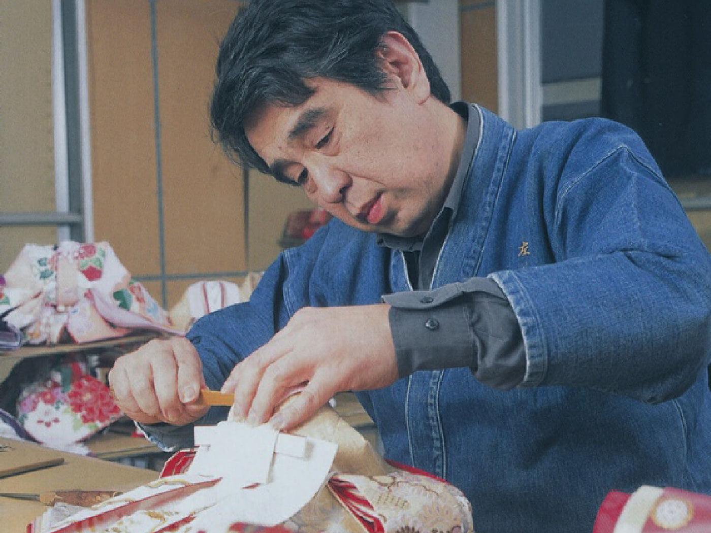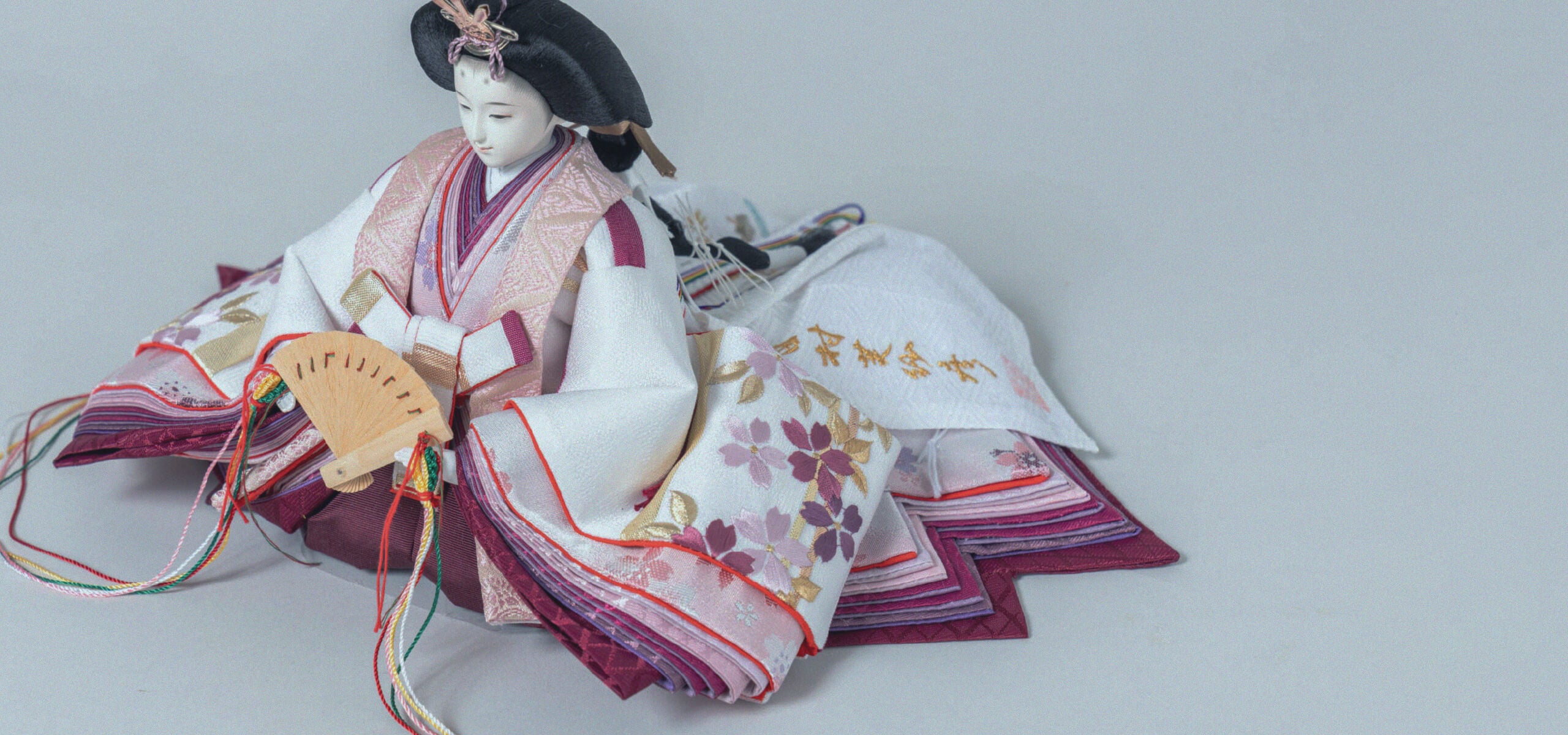 全てのお人形の衣装は完全オリジナルの生地を使用しています。生地屋さんでベースの布を選び、そこに入れる柄(刺繍や金彩)を決めます。デザイン、大きさ、配置・配色など全て私のイメージを生地屋さんに伝えて一種類ずつ作ってもらっています。その際、特に色に関しては洋色は避け、和の伝統色のみで作るようにしています。