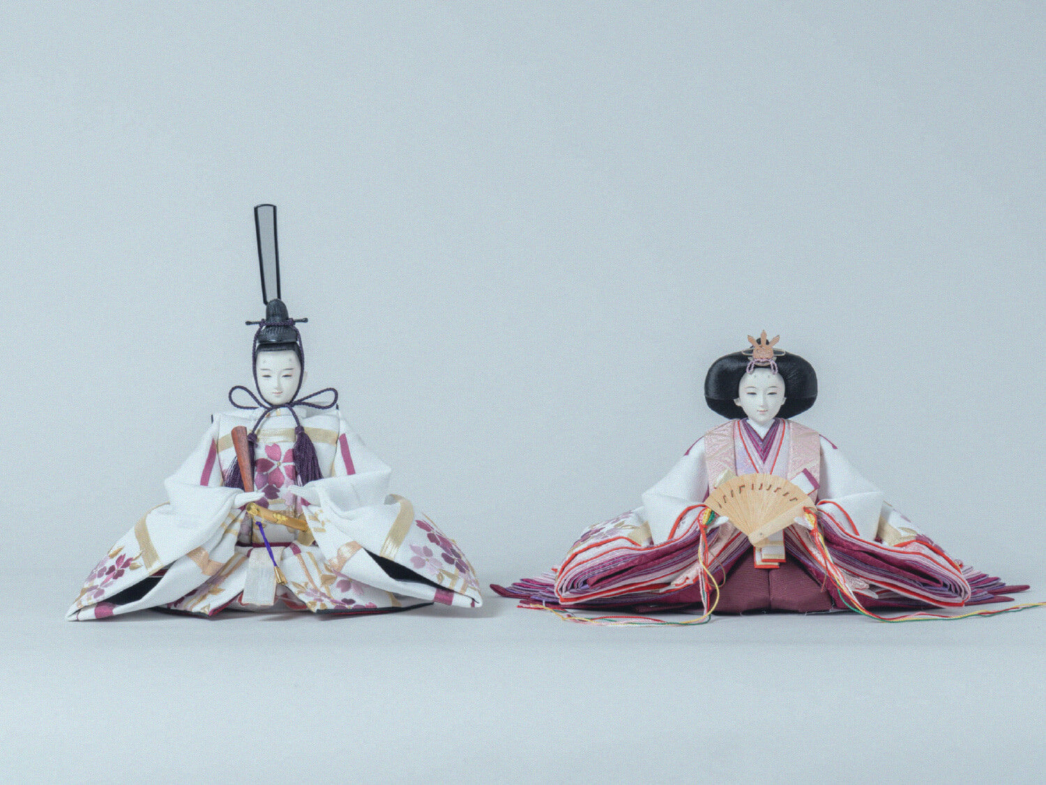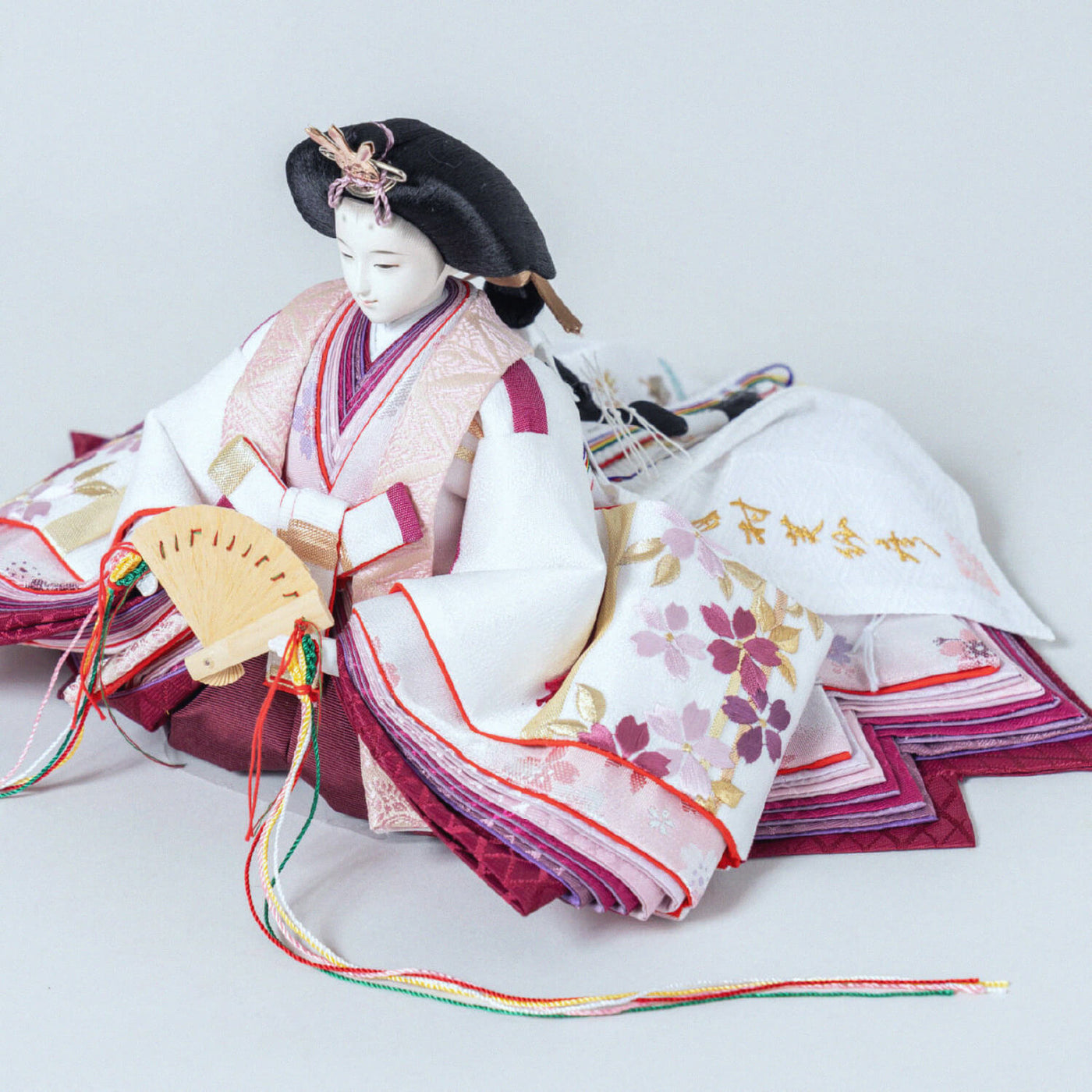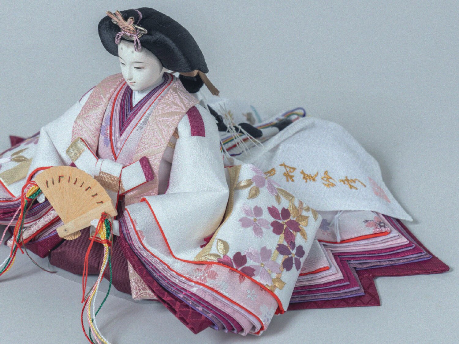 姫の裾が段々に少しずつズレてるでしょう。これは、着物を着て座った時の自然な感じを出すと同時に、内側の衣装の色目が綺麗に出るよう工夫しているんです。