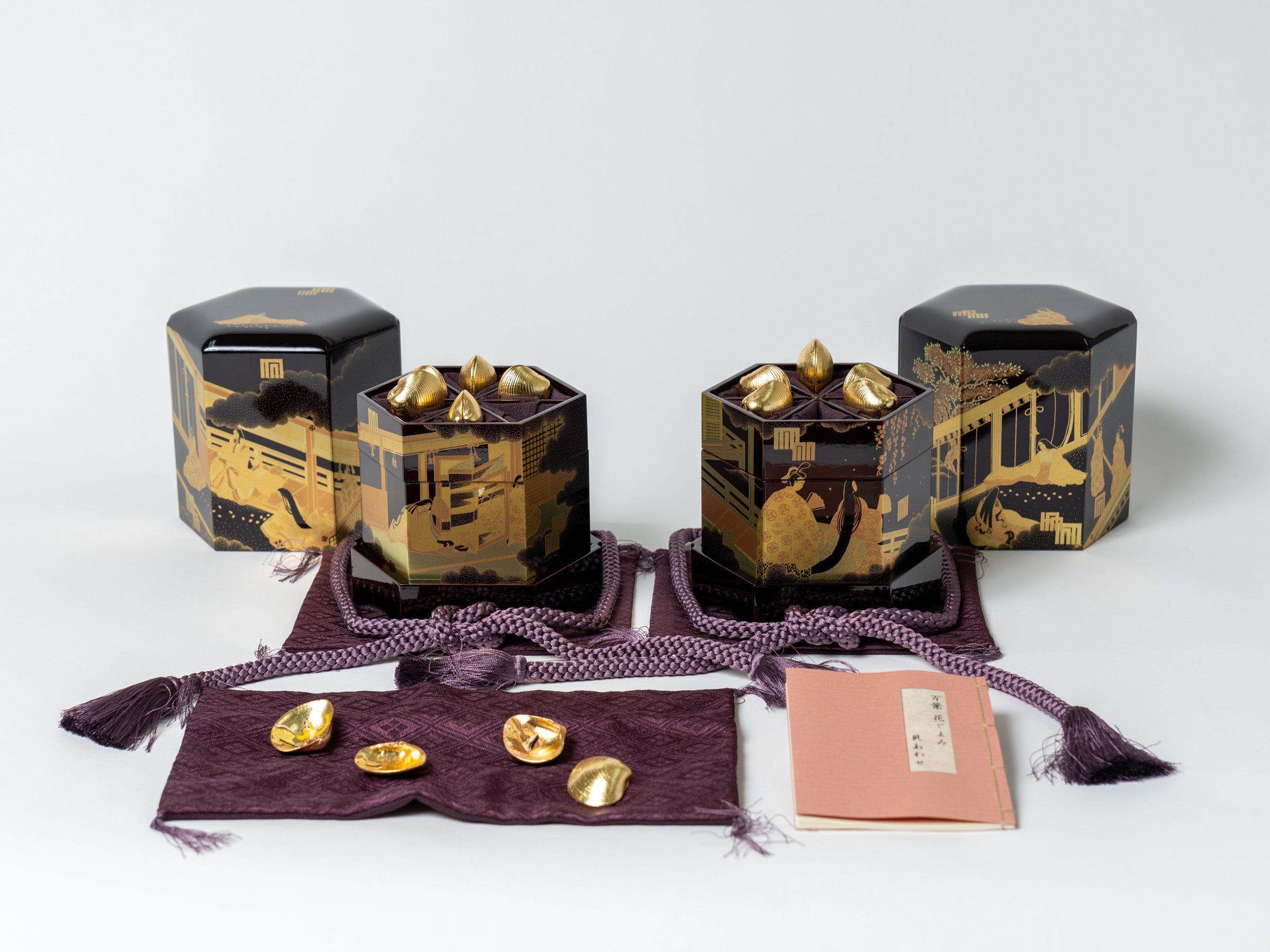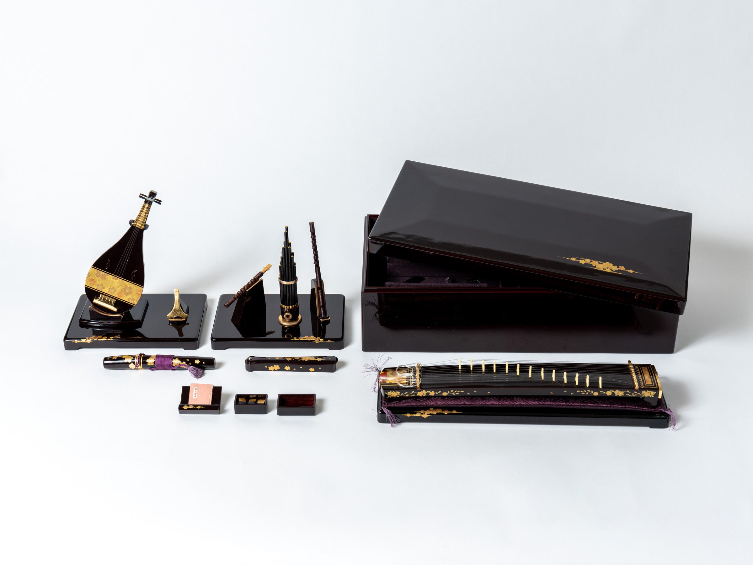 本物と見間違う程の精巧な仕上がりで、ひとつひとつの楽器に細やかで繊細な蒔絵の装飾が施されています。