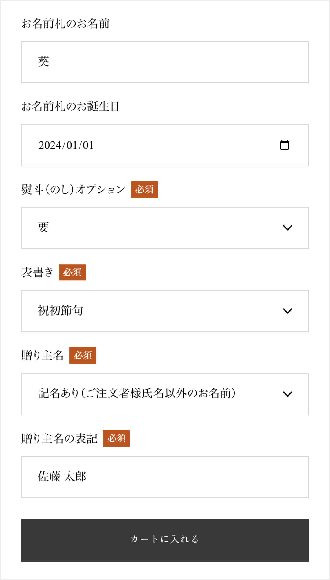 「要」を選択した場合は、「表書き」、「送り主名」の表記も必ずご入力ください。