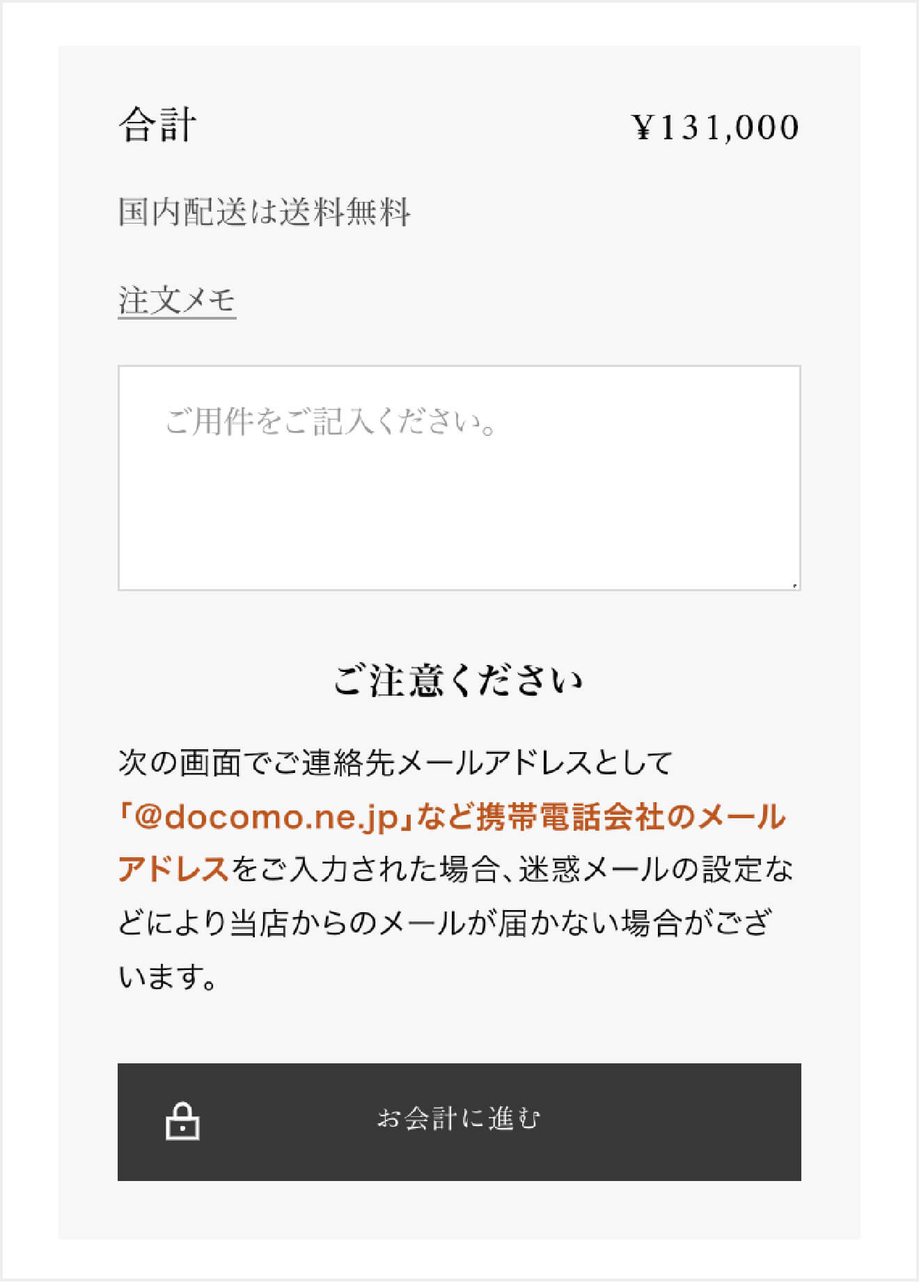 ご要望やご連絡事項がある場合は、「注文メモ」欄にご記入ください。