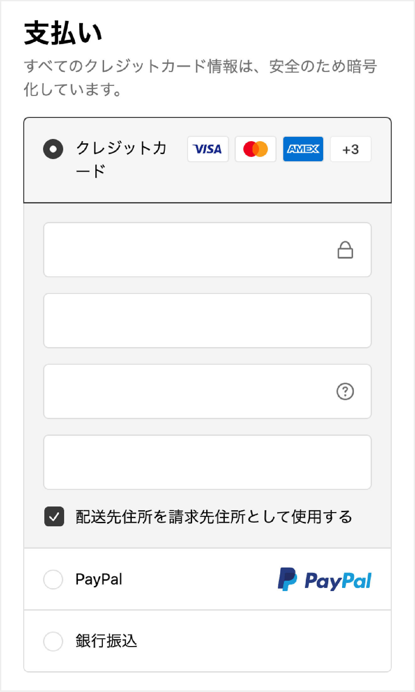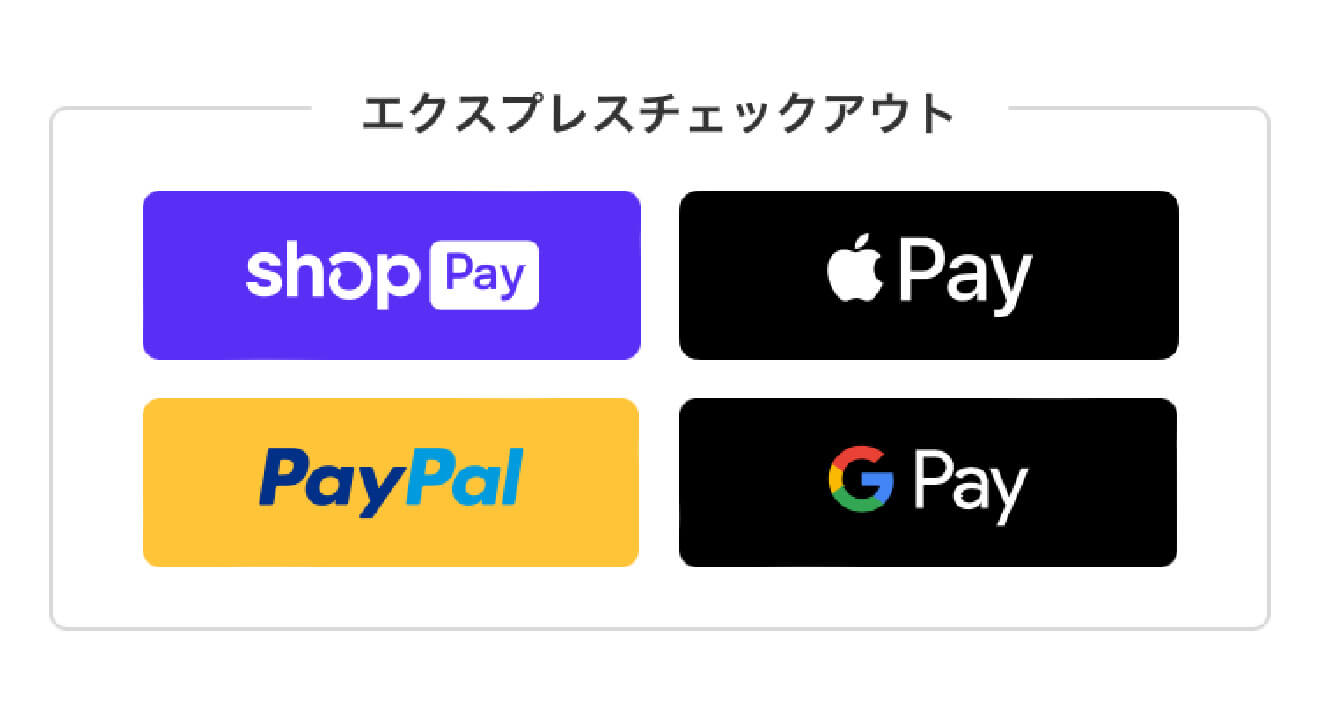 Shop Pay、Apple Pay、PayPal、Google Payのアカウントをお持ちの方は、個人情報やカード情報の入力を省略できる「エクスプレスチェックアウト」を利用していただくことも可能です。