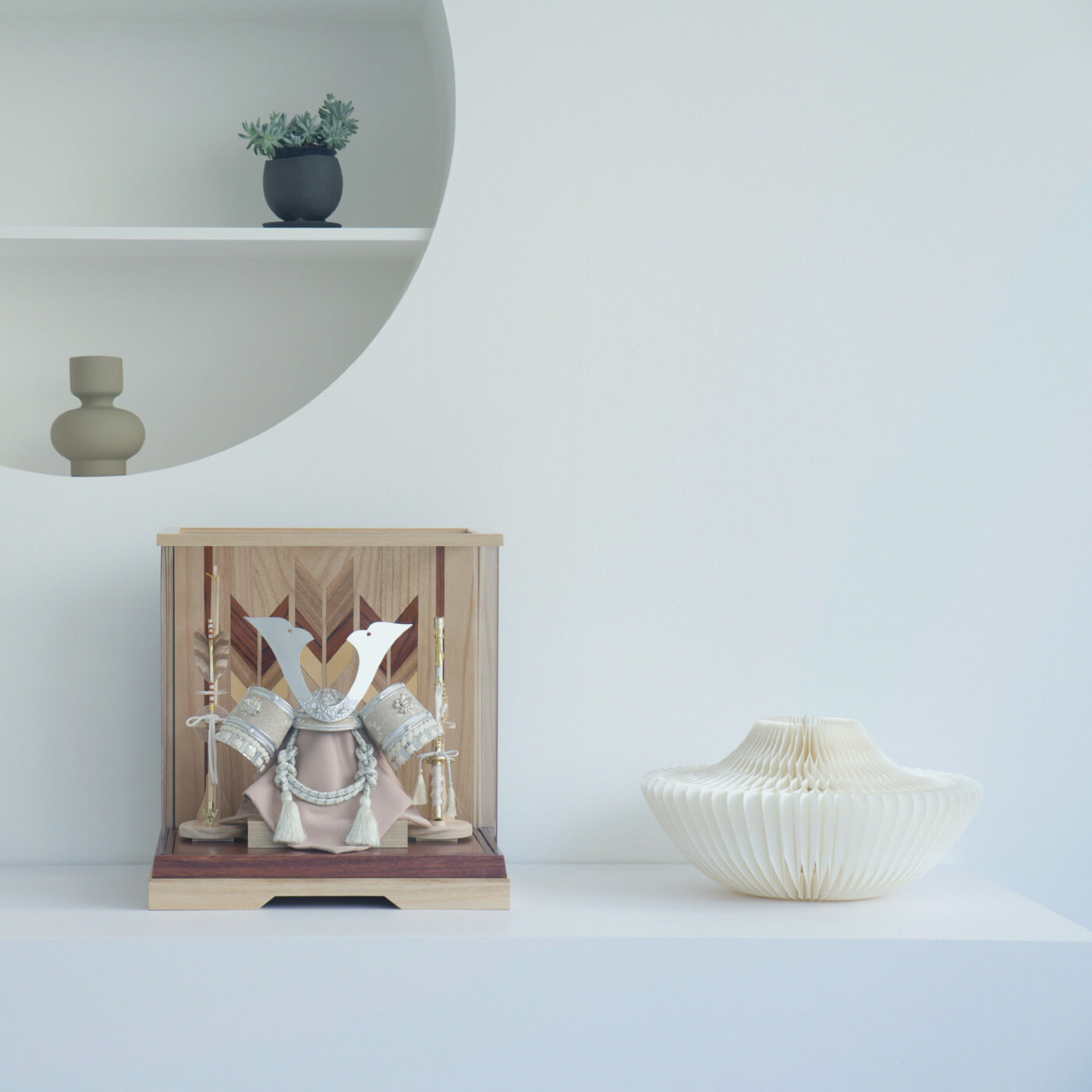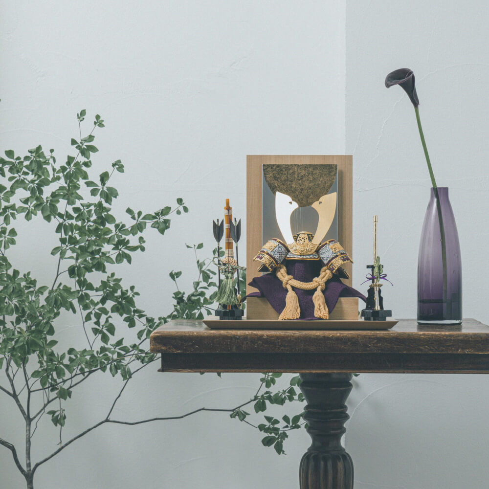手軽にどこでも飾れて、収納時は甲冑、飾台、弓太刀がすべてまとめて別箱に収まるため、収納スペースが限られているご家庭におすすめです。
