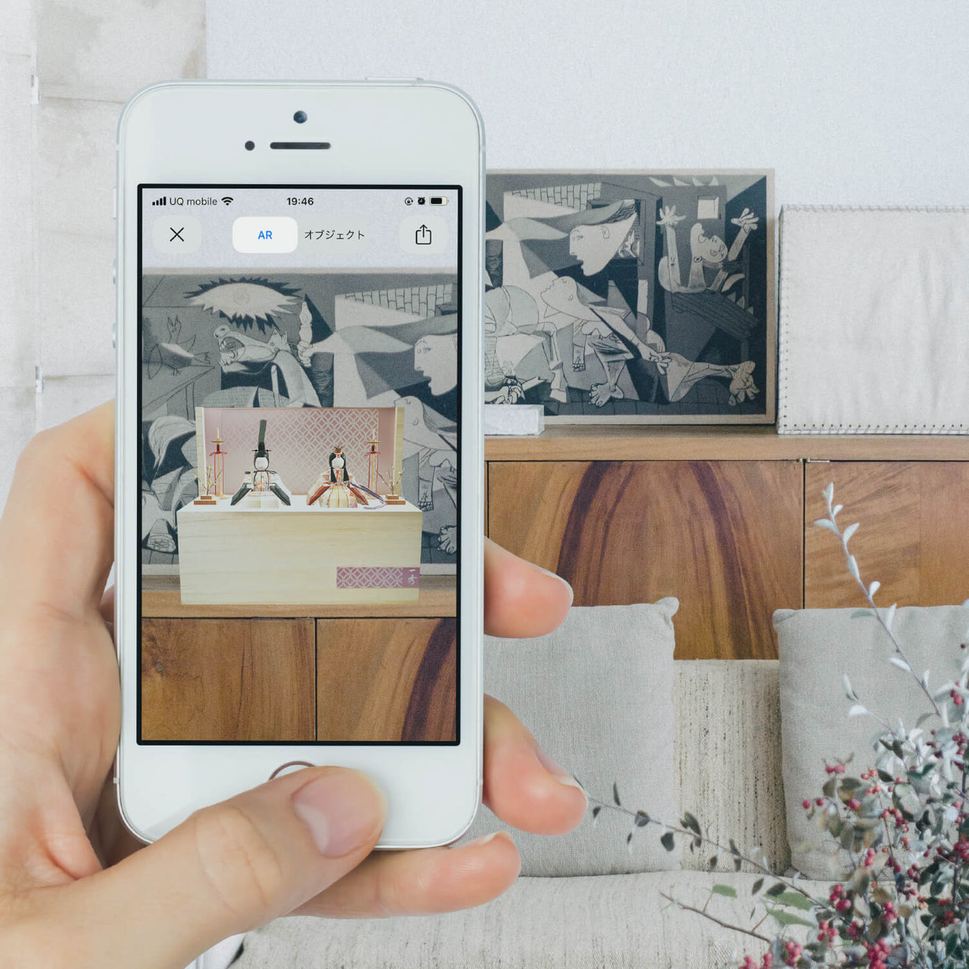 スマホのAR機能を使って、カメラで映したお部屋に3DのMAHOROBAのお人形を実寸で表示。ご自宅でレイアウトやコーディネートをお楽しみいただけます。