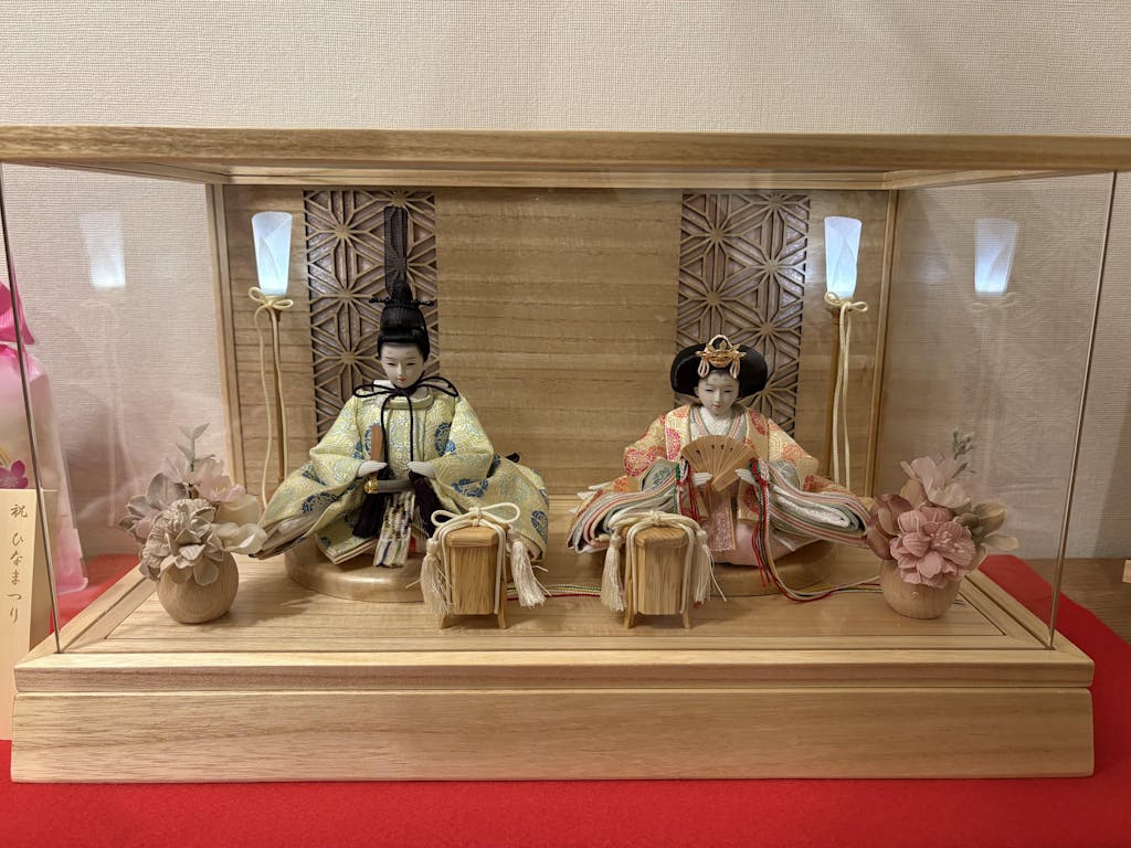 人形ケースはナチュラルな白木色。背面は麻の葉文様で装飾されています。