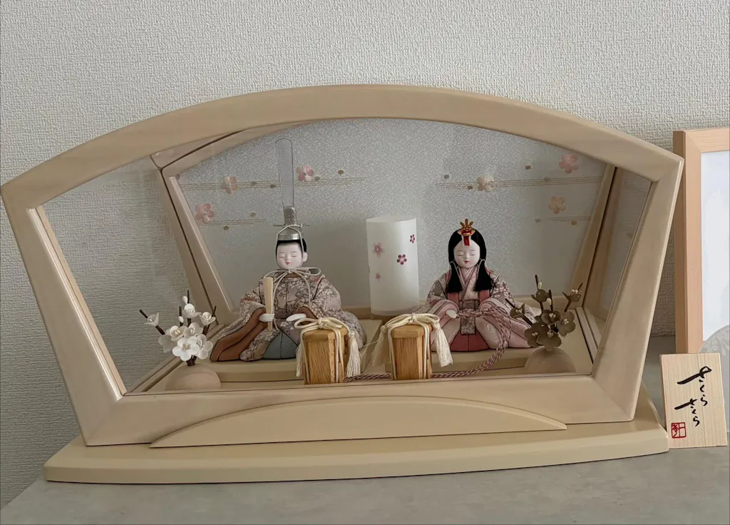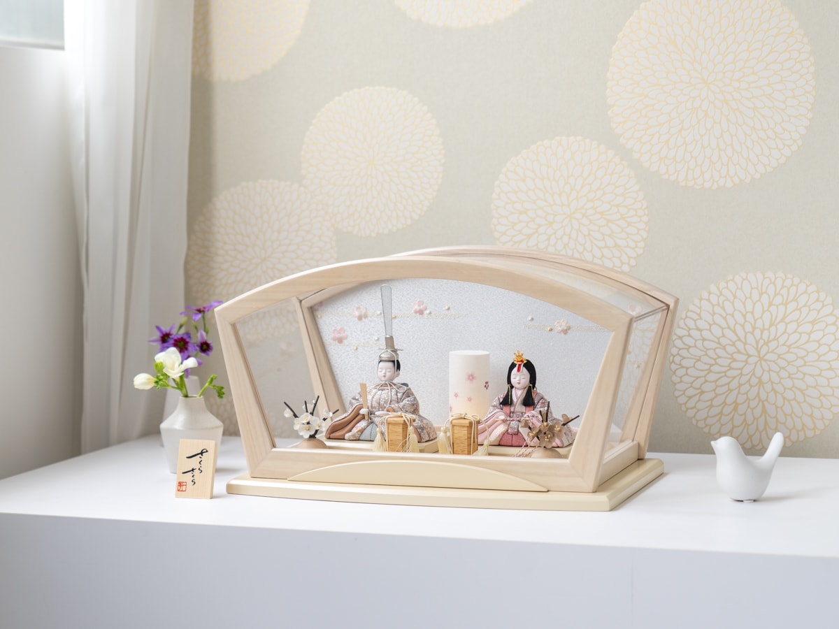 木目込み人形界を代表する江戸木目込み人形の伝統工芸士、木村一秀作の雛人形です。 お人形の顔は描き目で子どもの様な柔らかい表情。金ベージュ色の地に細かな桜の柄が織られた春らしいデザインの西陣織衣装です。 飾台は扇型の個性的なケース。ベージュとアイボリーのツートンになっていてインテリア全体に馴染む色合いです。 お道具は白木の貝桶セット。小さくても本物と同じ造りになっており職人の技が光る逸品です。 ブラウンにアレンジした紅白梅。背面には小桜柄のLED灯りスタンドの組み合わせ。 サイズがコンパクトなので、お部屋の何処に飾っても邪魔しないお勧めのセットです。