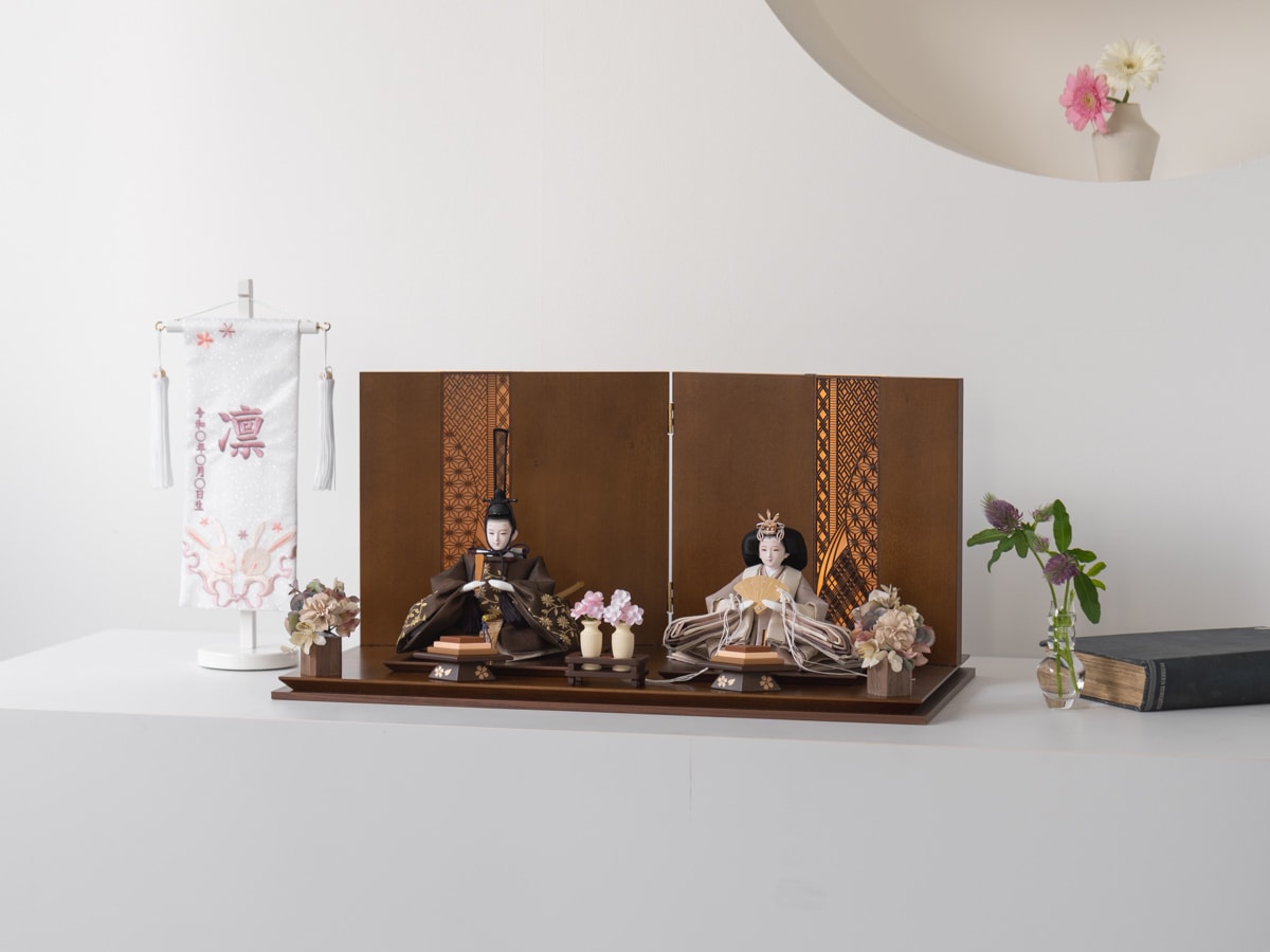 飾台と屏風は木目の美しい突板を使用し、シックなブラウンに仕上げています。