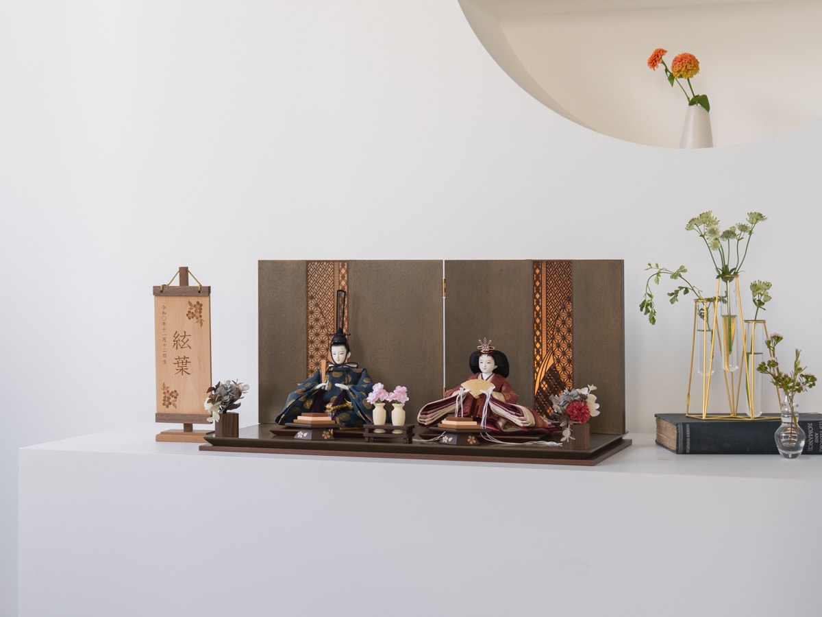 飾台と屏風は木目の美しい突板を使用し、温かみのあるグレー色に仕上げています。