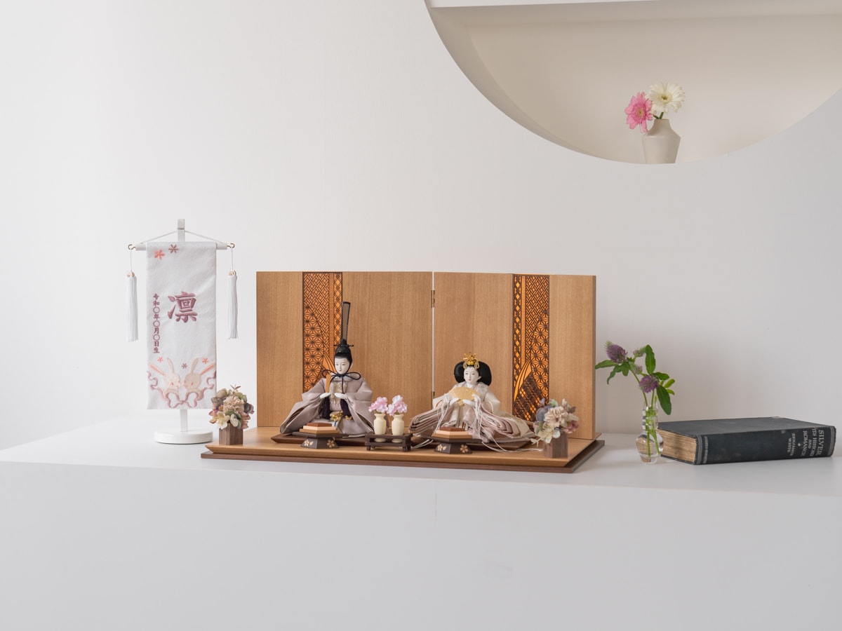 飾台と屏風は木目の美しい突板を使用し、温かみのあるナチュラル色に仕上げています。