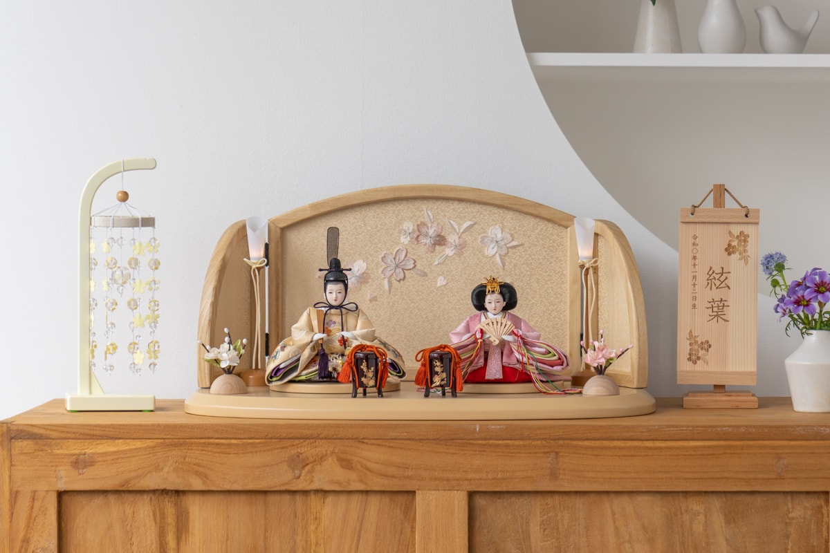 飾り台は木地色(ナチュラルな木の色)で丸型のシンプルな飾り台。背面には3枚(曲)の枠屏風。