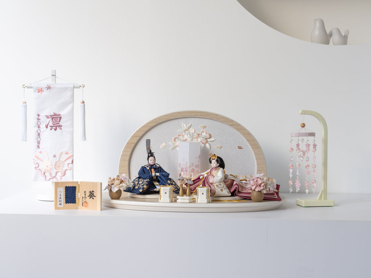 白系統の飾り台やお道具に紺の男雛が映える配色のセットです。